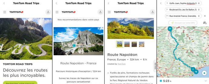 L’affichage se compose d’une carte, similaire à celle de Google Maps (mais la cartographie est propre à TomTom). Et il suffit de quelques clics pour trouver un lieu, une route, un point d’intérêt… Vous sélectionnez votre point de départ, une destination et éventuellement plusieurs étapes, et le logiciel crée un trajet synchronisé avec le GPS en quelques secondes dès que celui-ci à accès à internet. Le roadbook est automatiquement créé, et vous pouvez alors consulter l’itinéraire sur l’appareil.