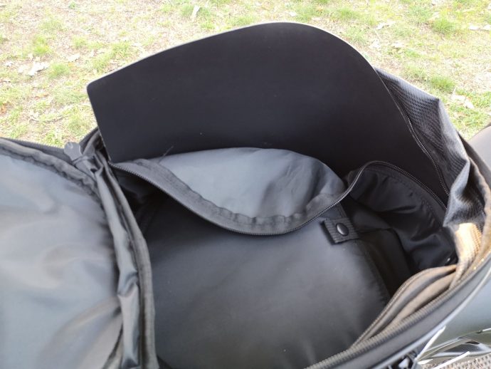 J’ai néanmoins trouvé une solution pour le montage sur la sportive en conservant un certain confort. En effet, après ouverture d’un zip à l’intérieur du sac, il est possible de retirer le renfort faisant le tour de celui-ci, transformant ce sac Kappa en sac entièrement souple. Débarrassé de sa rigidité, le bas du sac ne gêne plus le pilote.