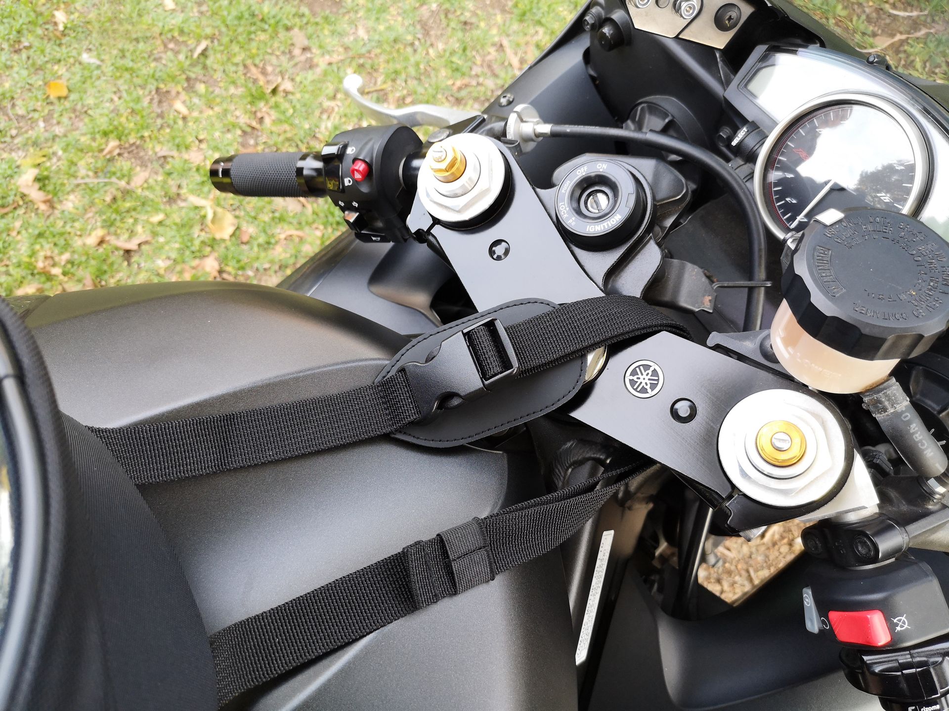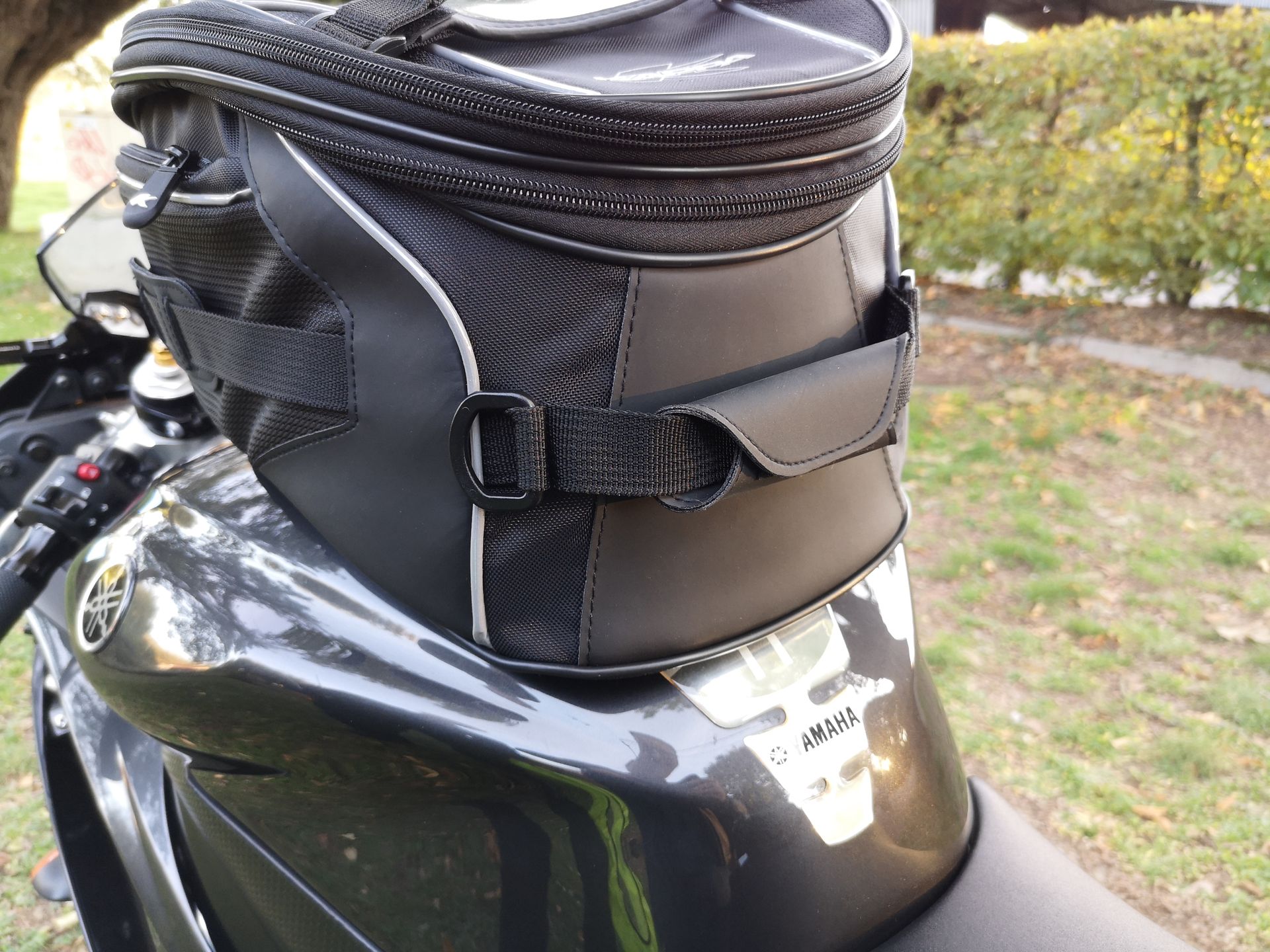 La magie opère par le biais d’une fixation montée sur la trappe de réservoir. Celle-ci se compose de deux pièces : le cerclage Tanklock, universel et fourni avec le sac. Et une bride de fixation vendue séparément, soit une plaque métallique à trous permettant de fixer le cerclage à la trappe à essence par l’intermédiaire de ses vis de fixation. Cette bride est spécifique au modèle de moto pour laquelle est destinée le sac. Elle se trouve pour environ 15 €. Dans mon cas, pour mes deux Yamaha disposant d’une trappe identique, la bride que j’ai dû me procurer est la BF05K. Vérifiez bien la compatibilité avec votre machine via l’onglet « compatibilité moto » présent sur chaque fiche produit.