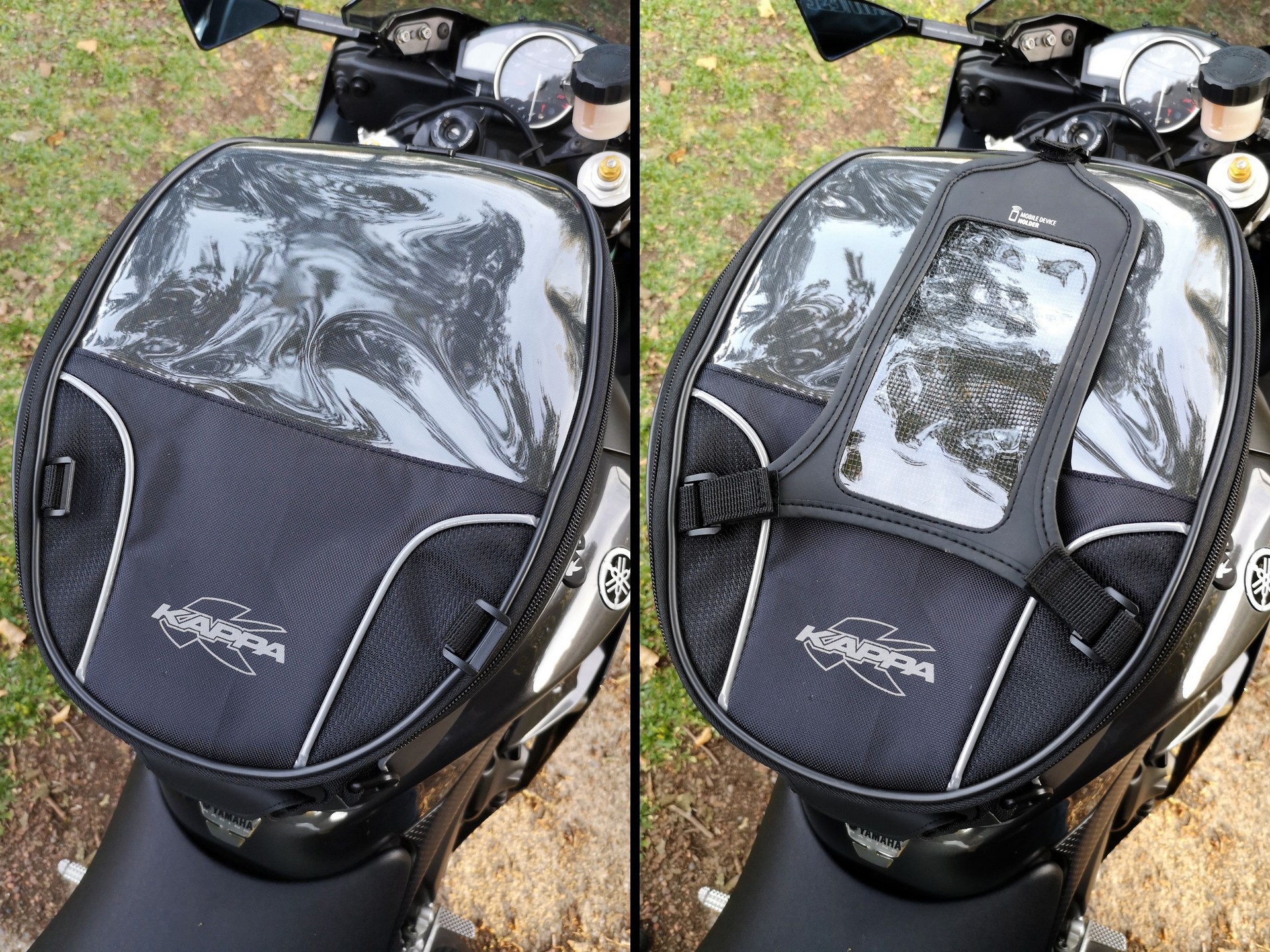 En revanche, la flasque (cerclage) Tanklock étant fournie avec le sac, il est impossible de monter une fixation sur le réservoir des deux motos afin de pouvoir passer le sac d’une machine à l’autre, sans passer par l’achat d’une flasque supplémentaire. À mon sens, et vu le coût de la pièce en plastique, il aurait été plus logique de la fournir dans le kit contenant la bride spécifique à la moto. Ainsi, on aurait eu un kit = une moto.
