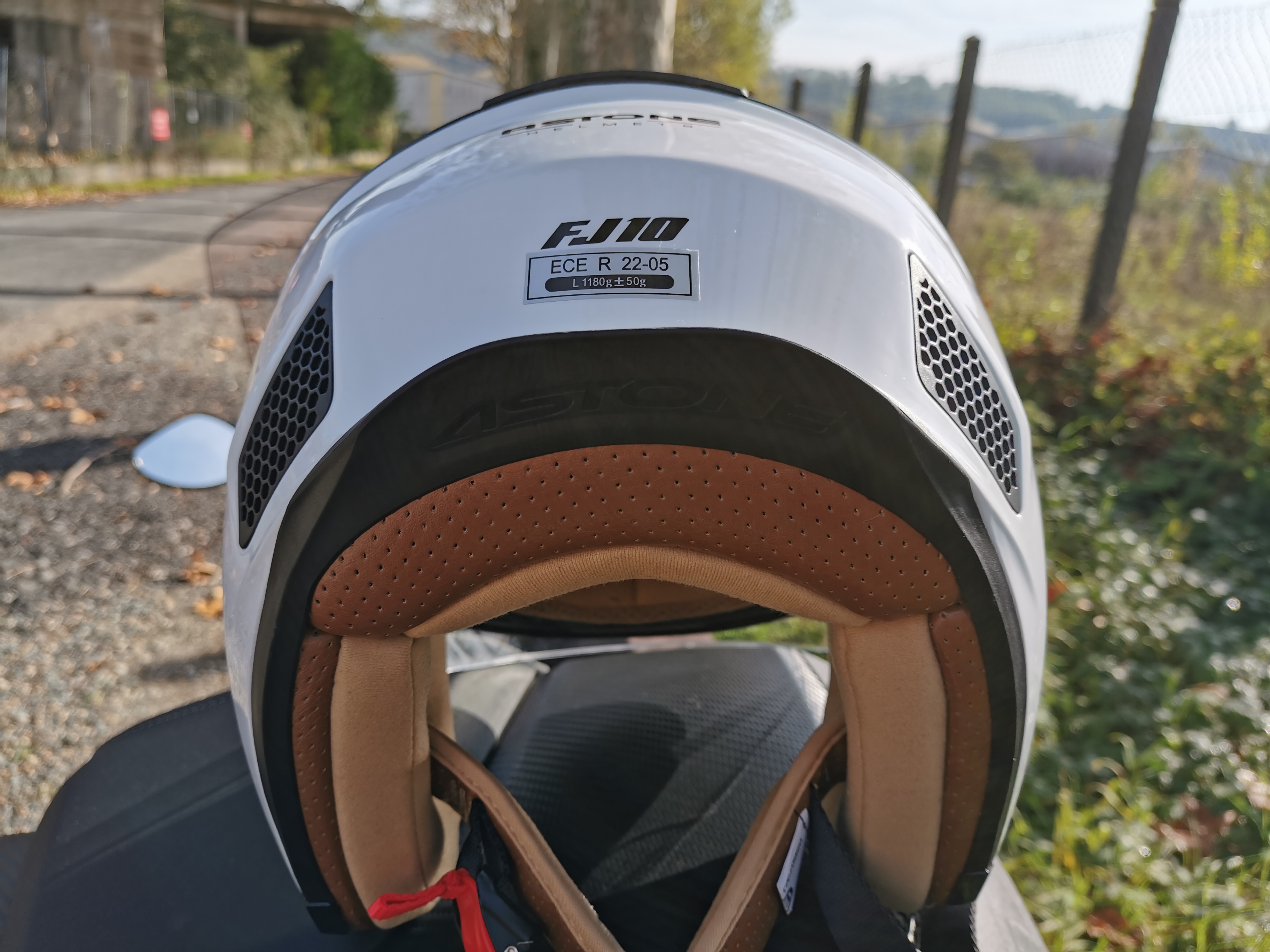 logo Astone embossé sur la jupe arrière du Jet et jolie finition beige/brune