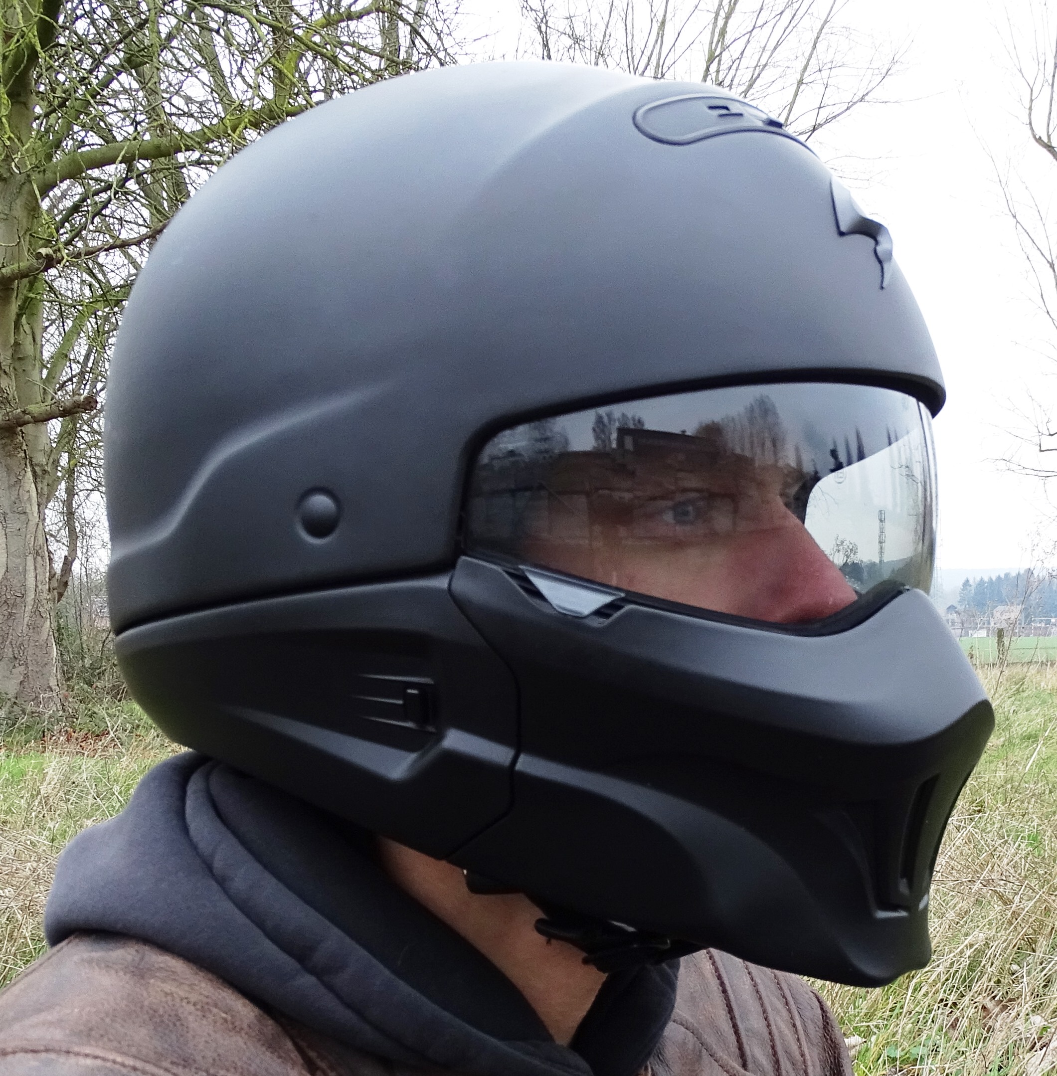 Accueil » Tests Produits » Equipement Motard » Casques » Essai du casque Scorpion Exo Combat Evolution » L’écran d’origine est très légèrement fumé et oblige le port de lunettes de soleil quand c’est nécessaire.
