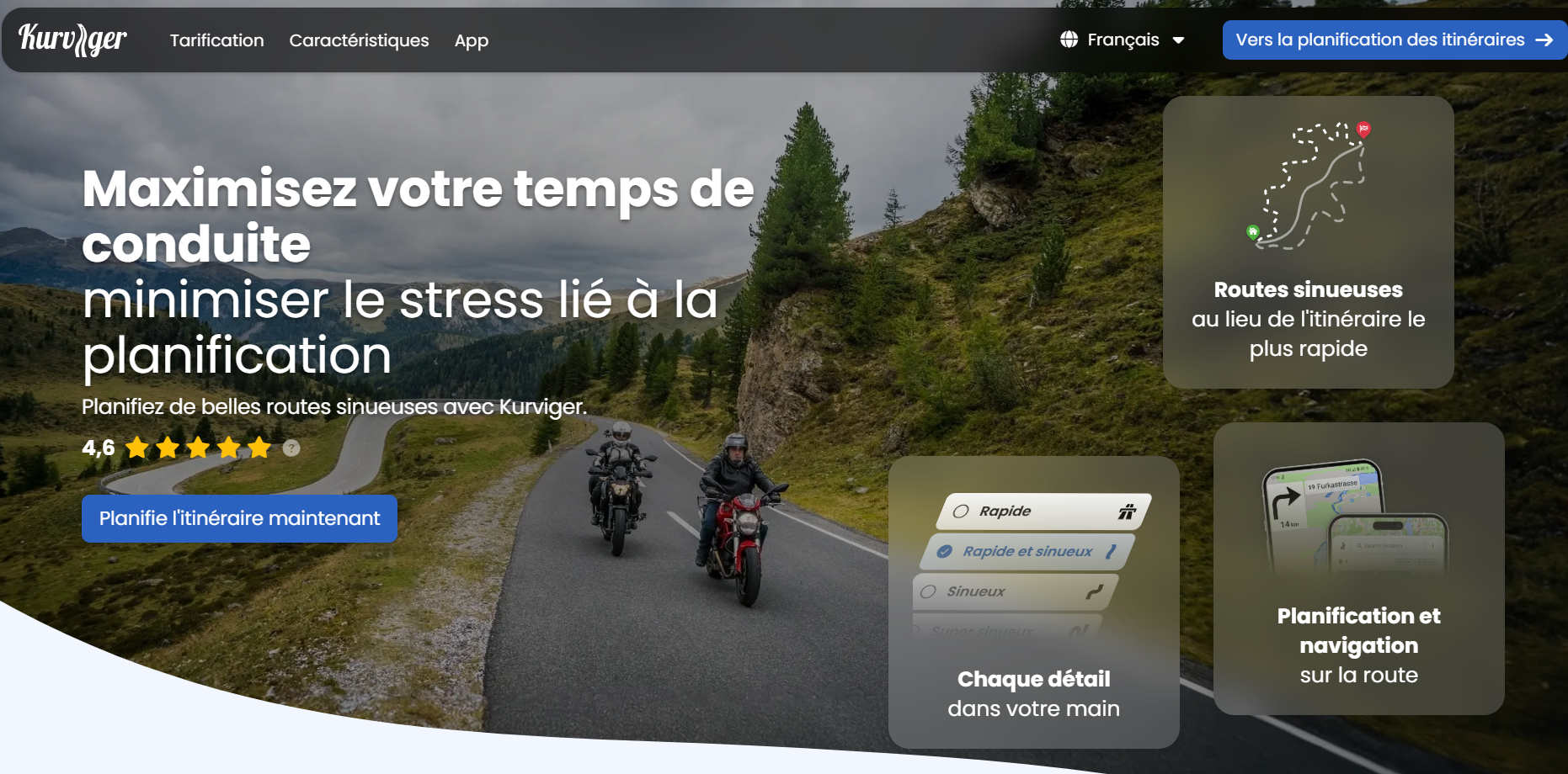 C’est aussi un spécialiste de la planification de tours, avec options pour éviter les autoroutes et privilégier les routes panoramiques. Elle fonctionne à la fois comme un planificateur de circuits sur le site web et comme application mobile, permettant de créer des balades personnalisées avec plusieurs points de passage, de définir la “courbure” des routes selon tes envies, et d’éviter certains types de voies (autoroutes, routes principales, etc.). L’application inclut des points d’intérêt pour motards comme des stations-service, des lieux de rencontre ou des hébergements adaptés, pour enrichir ta balade. En résumé, Kurviger t’aide à trouver des routes plaisantes, planifier des balades sur mesure et te guider lors de tes sorties moto pour une expérience plus agréable et personnalisée.
